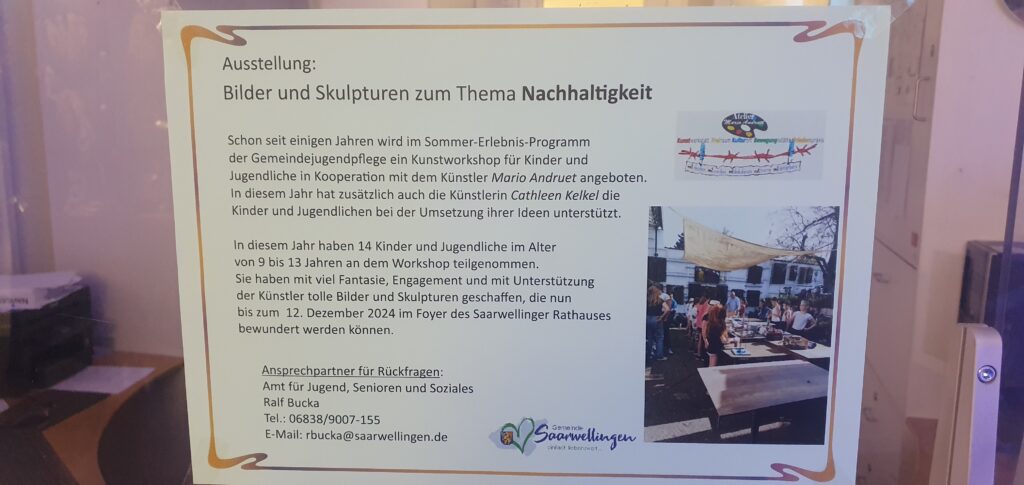 Jungen Künstlern Raum gegeben – Vernissage im Foyer des Rathauses Saarwellingen Am 23. Oktober 2019 findet im Foyer des Rathauses in Saarwellingen die Vernissage des KUNSTworkshops des Sommer-Erlebnis-Programms 2019 statt. In den Sommerferien haben sich Mädchen und Jungen an zwei Terminen getroffen und gemeinsam ihrer Kreativität freien Lauf gelassen. So sind aus Recyclingmaterialien zahlreiche Kunstwerke entstanden. Diese werden an dem Mittwoch, 23. Oktober 2019 ab 17:30 Uhr enthüllt. Bürgermeister Manfred Schwinn, die Künstler Mario Andruet und Cathleen Kelkel werden gemeinsam mit den jungen Künstlerinnen und Künstlern die Bilder präsentieren. Musikalisch wird die Vernissage von Michelle Jenal untermalt. Zu der Vernissage sind alle interessierten Bürgerinnen und Bürger eingeladen. Die Kunstwerke werden danach noch einige Zeit im Foyer des Rathauses ausgestellt.